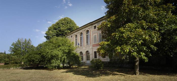 La villa è preceduta da un ampio giardino diviso in due settori dal viale di accesso centrale all’asse dell’edificio ed è situata lungo la strada come è caratteristico delle costruzioni del XVIII secolo.