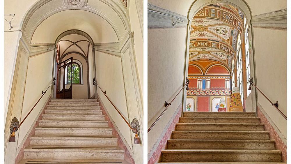 Al piano terreno oltre all’atrio che si apre nel porticato si trovano due saloni e i locali di servizio, sul alto sinistro trovasi la scala di collegamento con il piano superiore costituita da due rampe in travertino; al primo piano o pianonobile, si trova sempre il loggiato chiuso e da qui si passa in un ampio salone centrale che a sua volta immette in due salottini che sfociano in una galleria a vetri (Galleria dei busti) che guarda sul boschetto, le ali laterali erano occupate da una serie di camere, al secondo piano si trovavano locali di servizio.